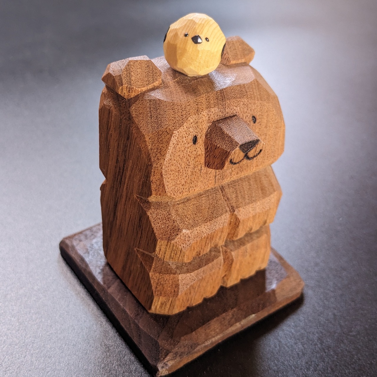 材質:くまお(クルミ)、シマエナガ(ひのき)、台(ウォールナット)